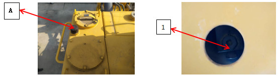 1、把推土鏟和松土器降到地面,使之停放牢靠,關(guān)閉發(fā)動機,并慢慢地轉(zhuǎn)動加油口(A)的蓋以釋放內(nèi)部壓力。然后把蓋拆下。