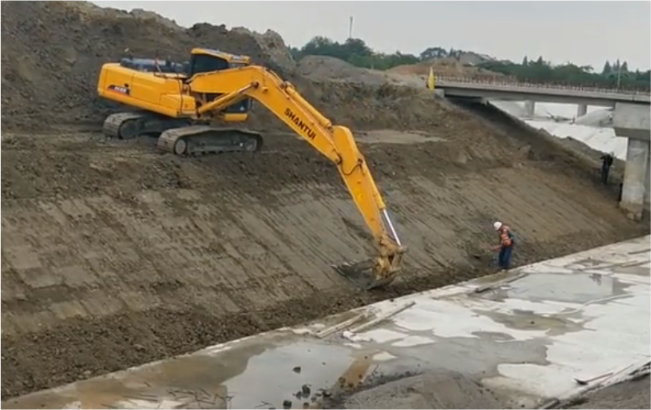 山東省內(nèi)某河道開挖施工,山推SE215高效修坡施工,操控輕便、控制精準(zhǔn),精細(xì)化修坡作業(yè)。